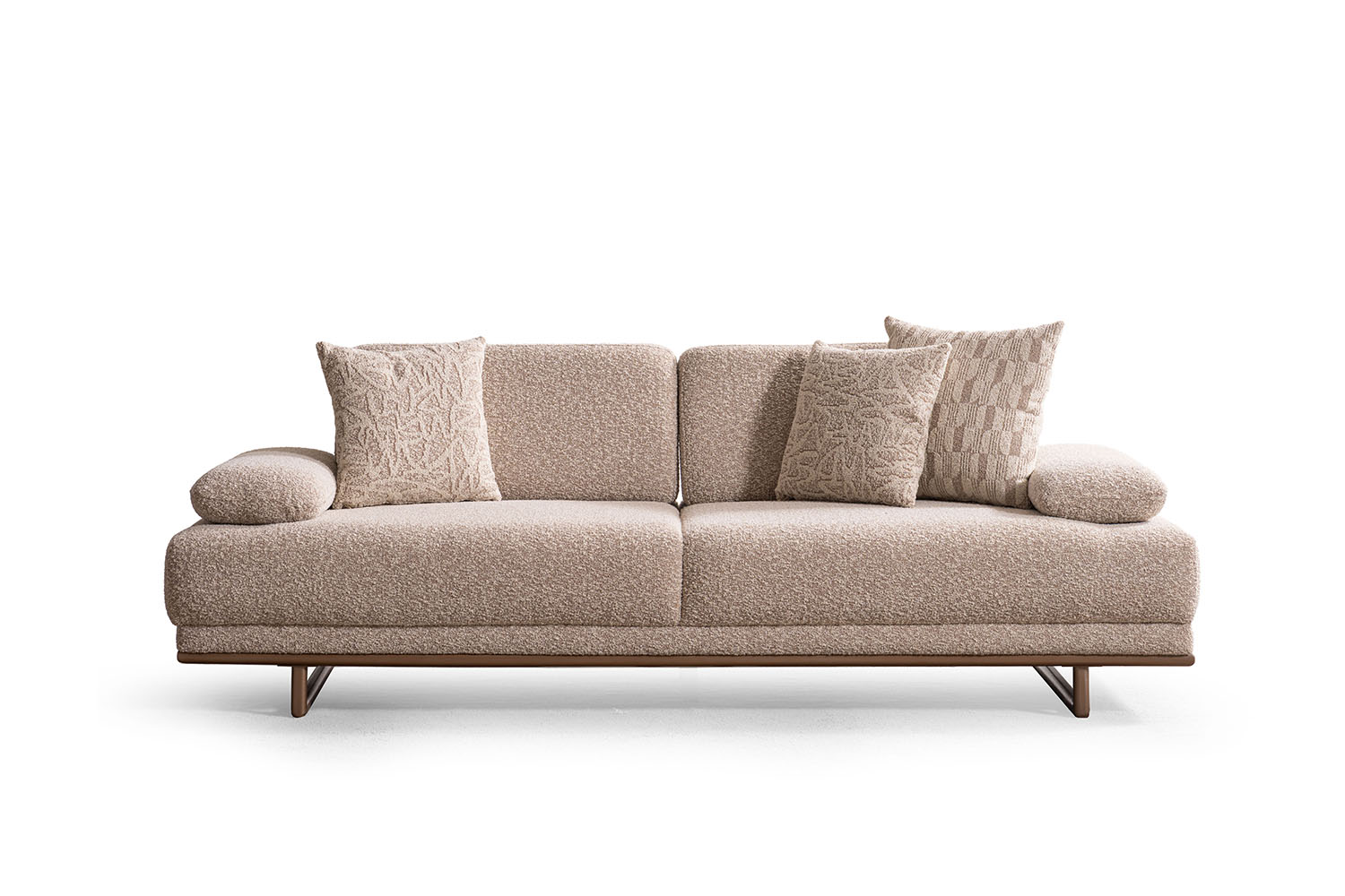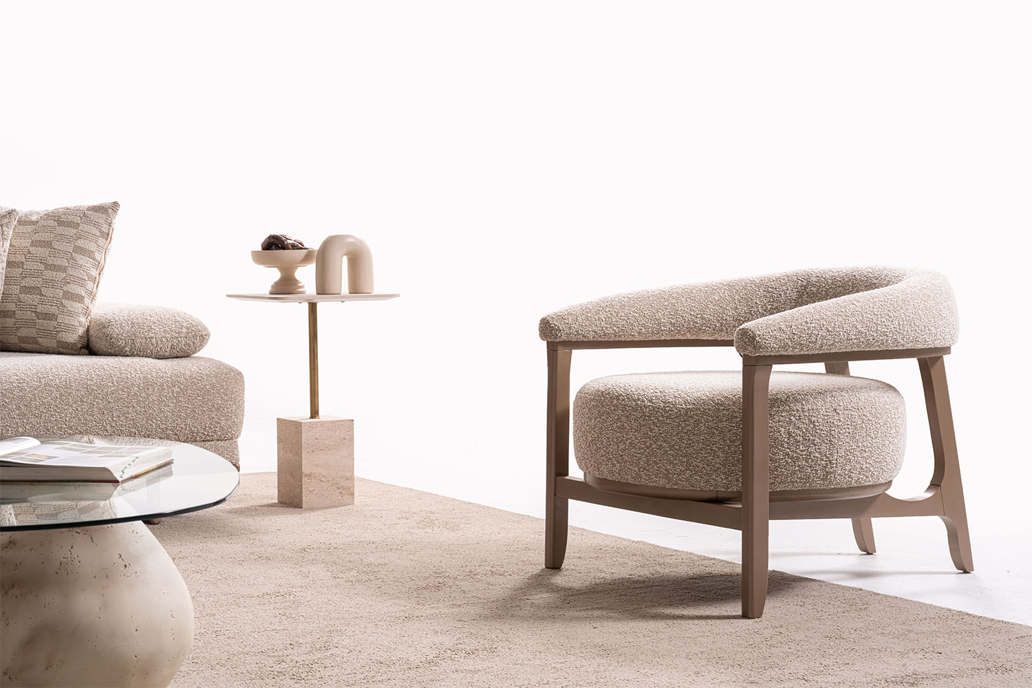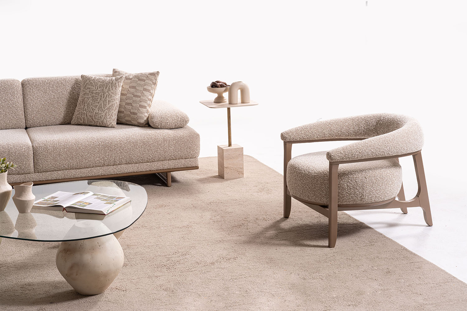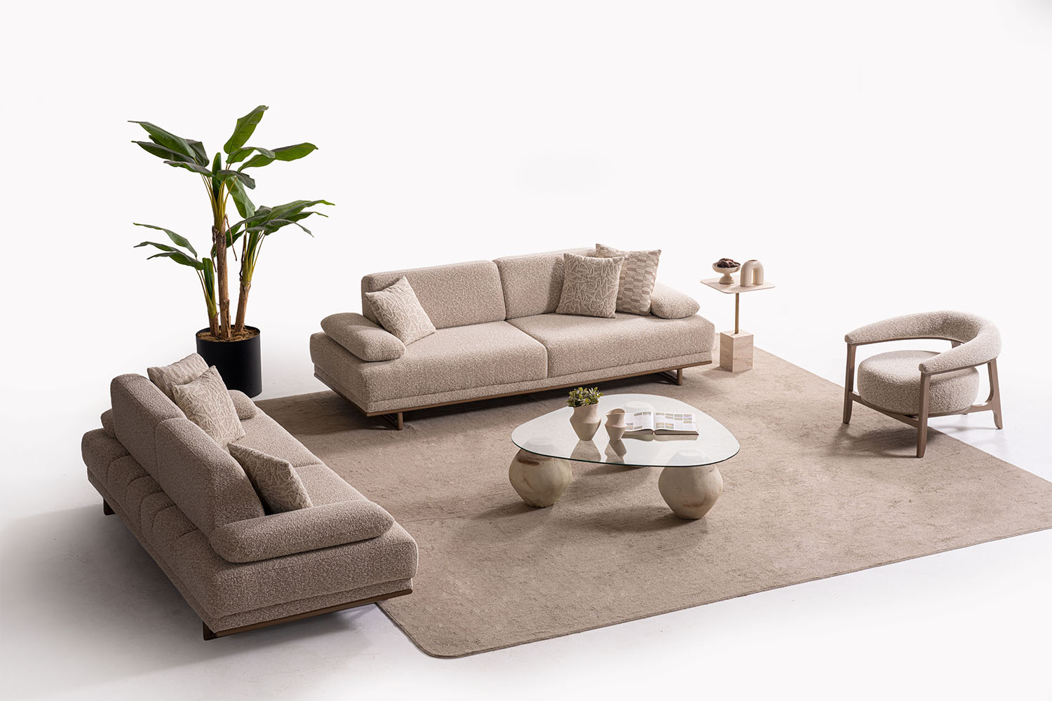 Bu koltuk takımı, sade ve zarif tasarımıyla modern yaşam alanlarına sıcak bir dokunuş katıyor. Yumuşak dokulu kumaşı, doğal tonları ve yuvarlak hatlarıyla konfor ve şıklığı bir arada sunuyor. Minimalist tarzı sayesinde her ortama kolayca uyum sağlar.