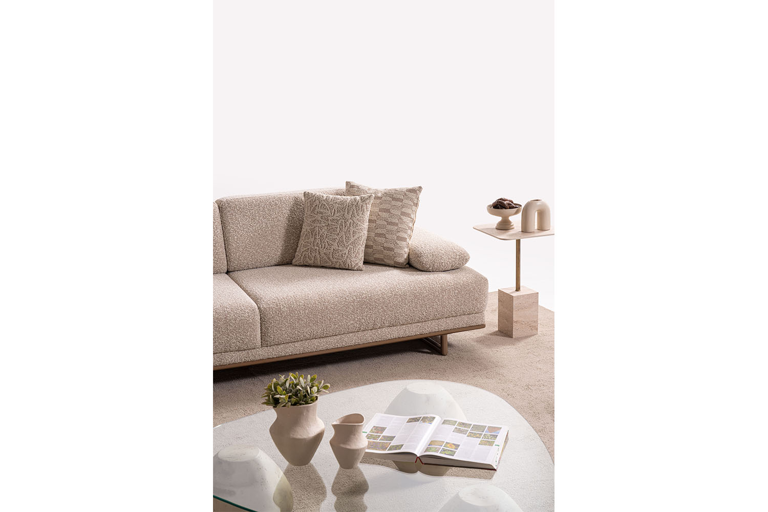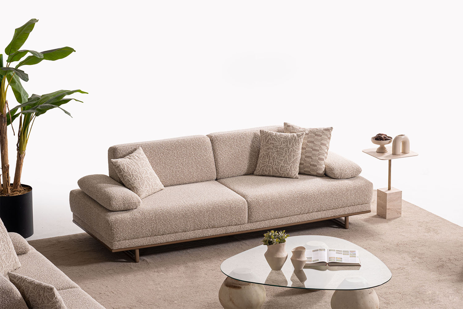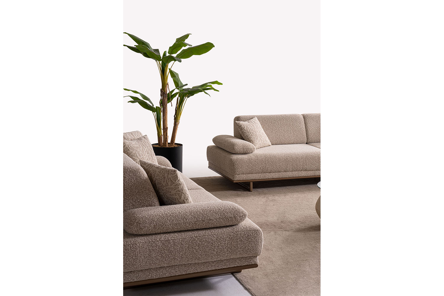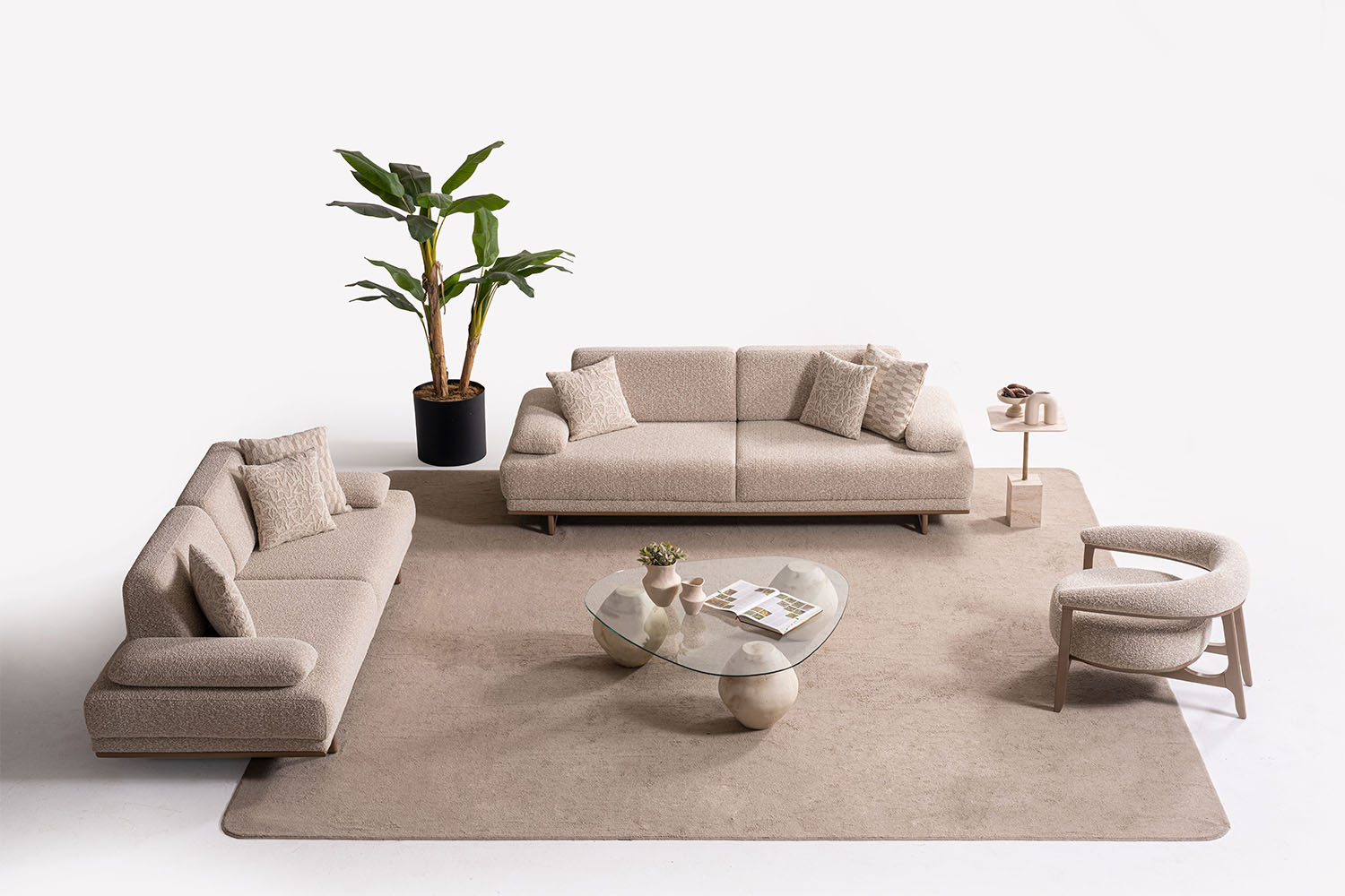 Bu koltuk takımı, sade ve zarif tasarımıyla modern yaşam alanlarına sıcak bir dokunuş katıyor. Yumuşak dokulu kumaşı, doğal tonları ve yuvarlak hatlarıyla konfor ve şıklığı bir arada sunuyor. Minimalist tarzı sayesinde her ortama kolayca uyum sağlar.