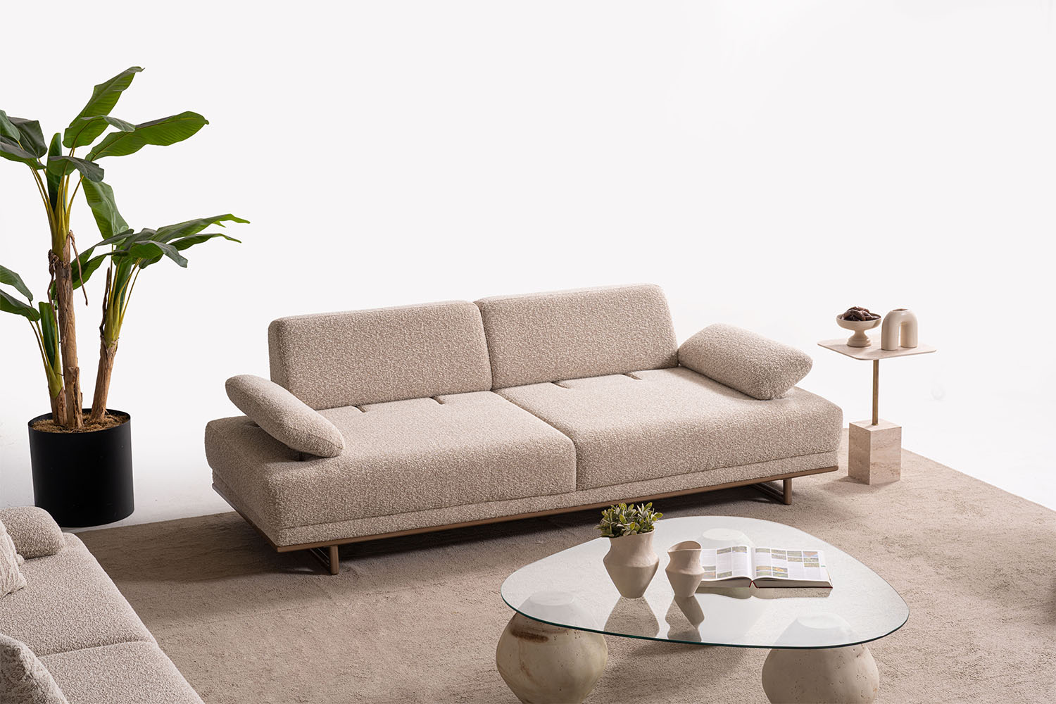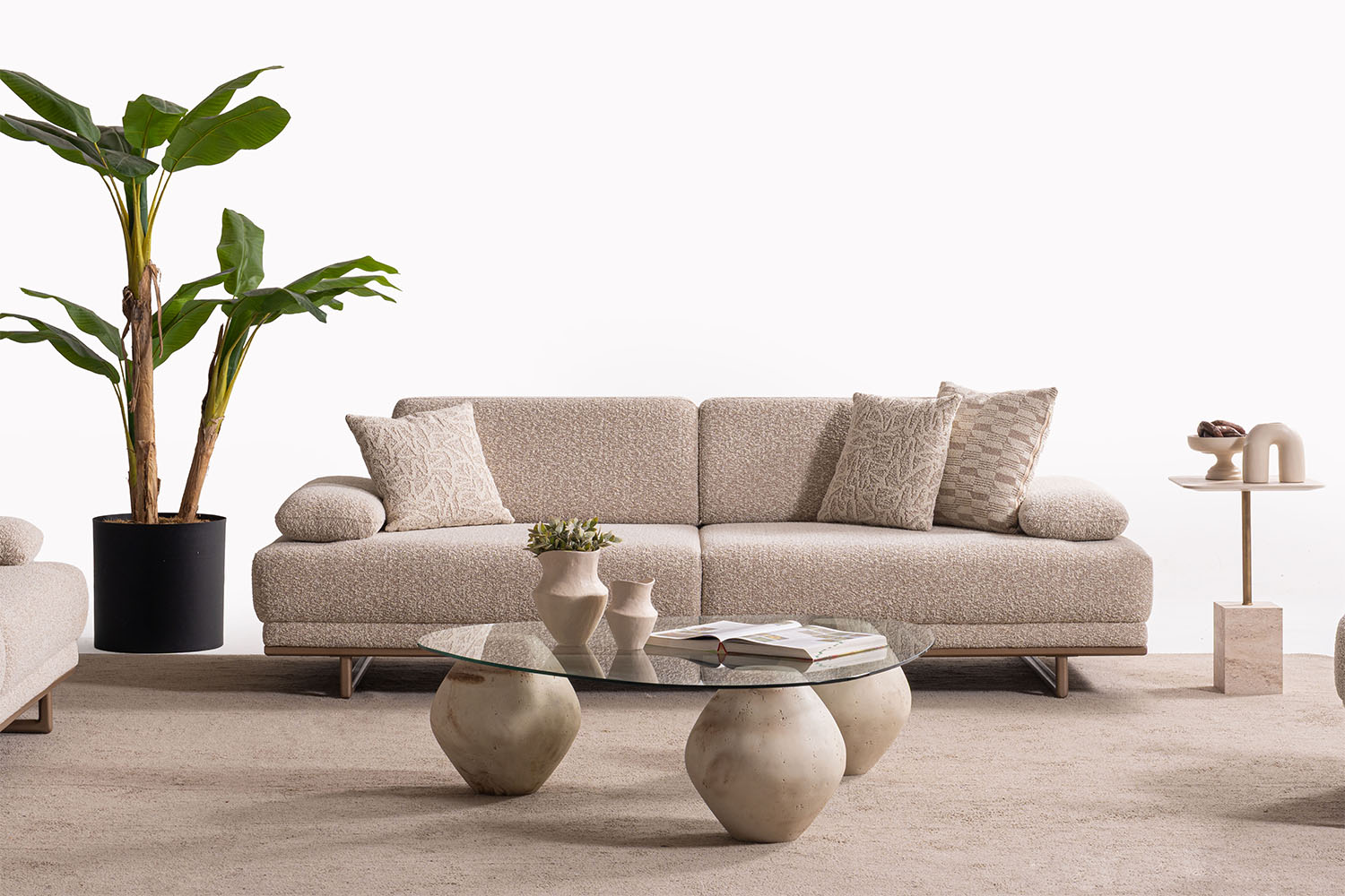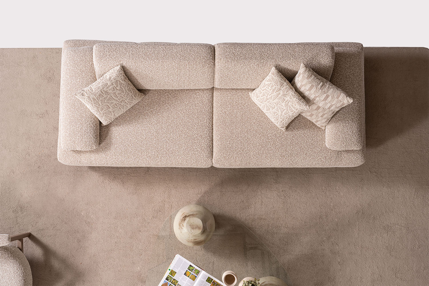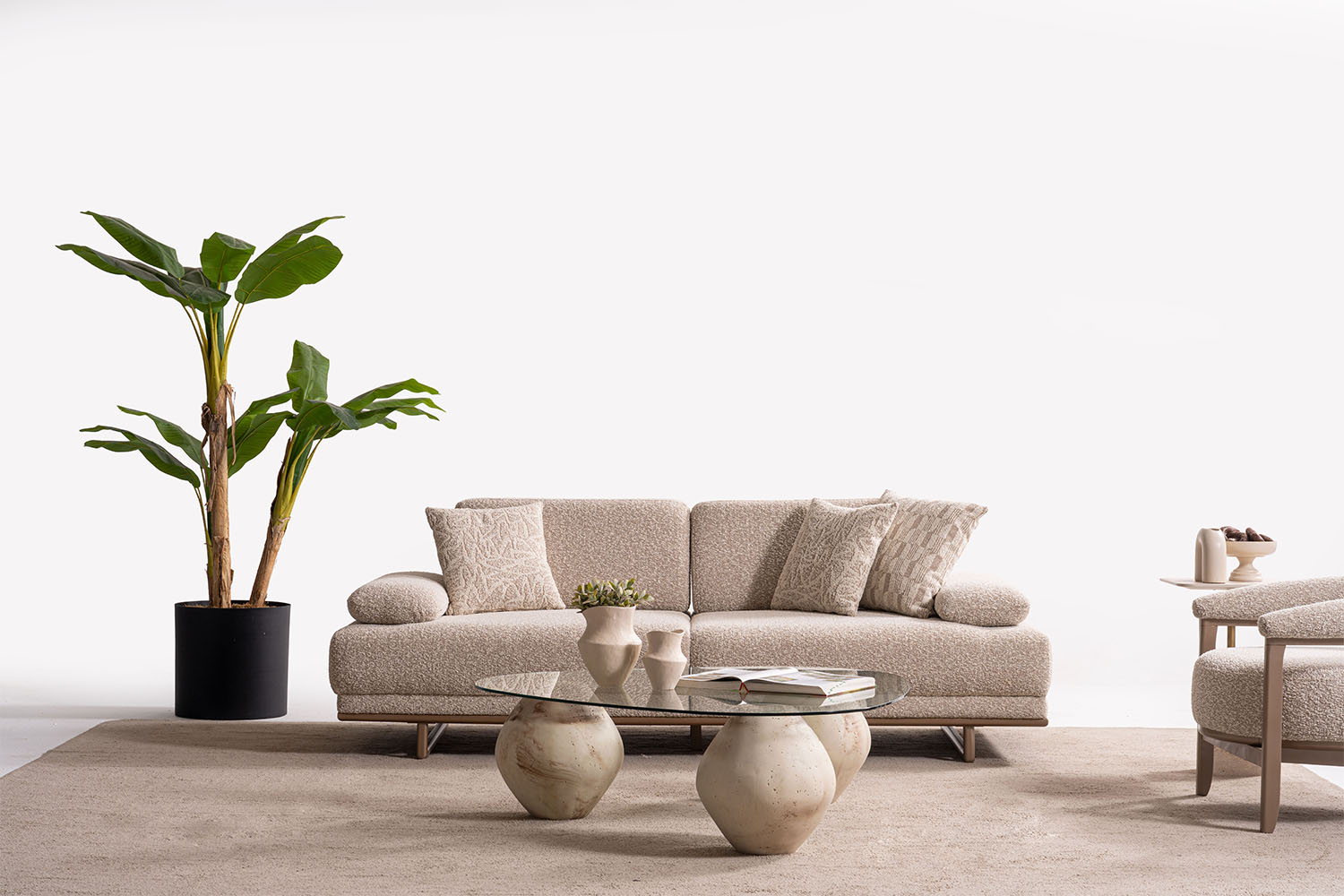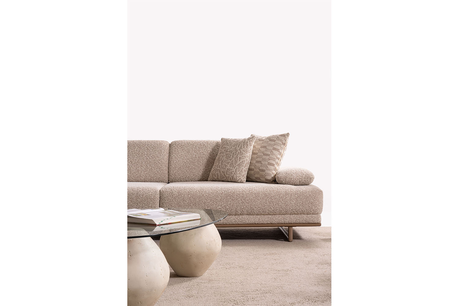 Bu koltuk takımı, sade ve zarif tasarımıyla modern yaşam alanlarına sıcak bir dokunuş katıyor. Yumuşak dokulu kumaşı, doğal tonları ve yuvarlak hatlarıyla konfor ve şıklığı bir arada sunuyor. Minimalist tarzı sayesinde her ortama kolayca uyum sağlar.
